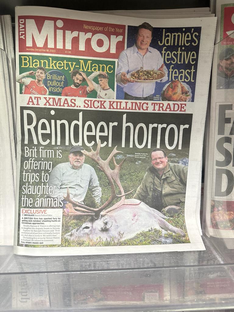 На сторінці газети знаменитий британський шеф-кухар Джеймі Олівер демонструє індичку для різдвяної вечері, тоді як у нижній частині розміщено статтю про “хвору торгівлю вбивством” із фотографією здобутого північного оленя. “Цікаво, до чого саме відноситься заголовок про ‘хвору торгівлю вбивством’ — до жорстоко забитої індички Джеймі Олівера у верхньому правому куті чи до мертвого північного оленя на нижньому фото?” — іронізує Хог.