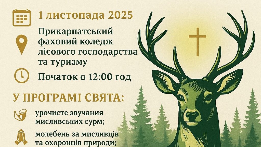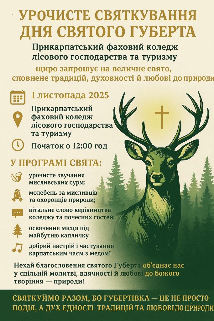 Прикарпатський фаховий коледж лісового господарства та туризму щиро запрошує на величне свято, сповнене традицій, духовності й любові до природи — урочисте святкування Дня святого Губерта. Захід відбудеться 1 листопада 2025 року з початком о 12:00 год. Про це повідомляє Прикарпатський фаховий коледж лісового господарства та туризму.