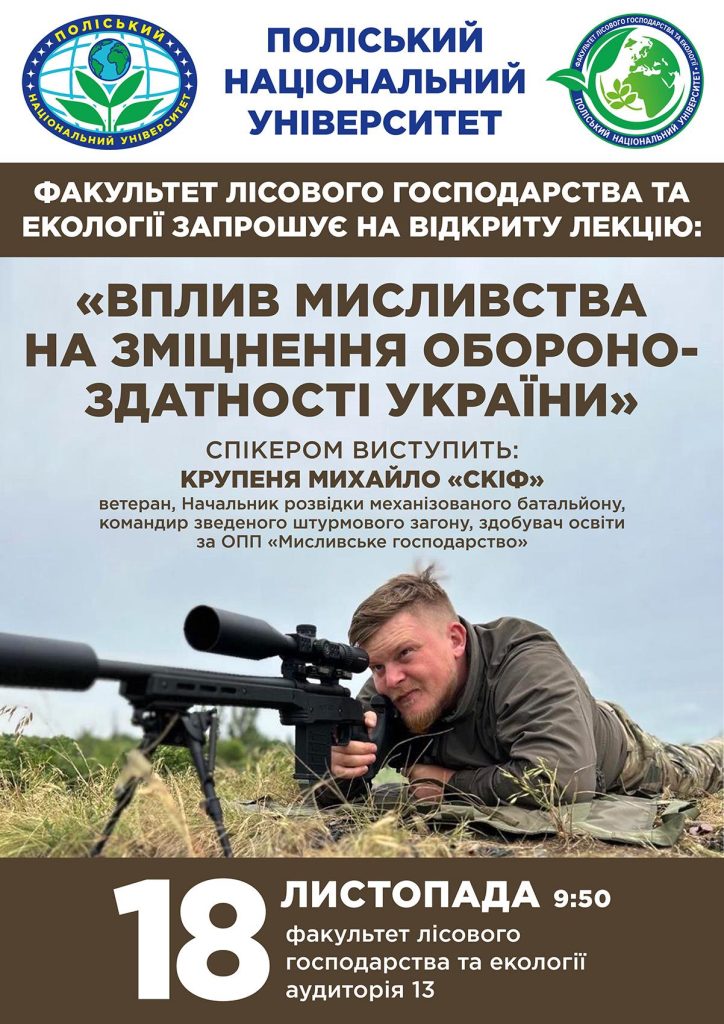 18 листопада о 9:50 на факультеті лісового господарства та екології Поліського національного університету відбудеться відкрита лекція “Вплив мисливства на зміцнення обороноздатності України” з ветераном війни Михайлом Крупенею. Про це повідомляє факультет лісового господарства та екології університету.