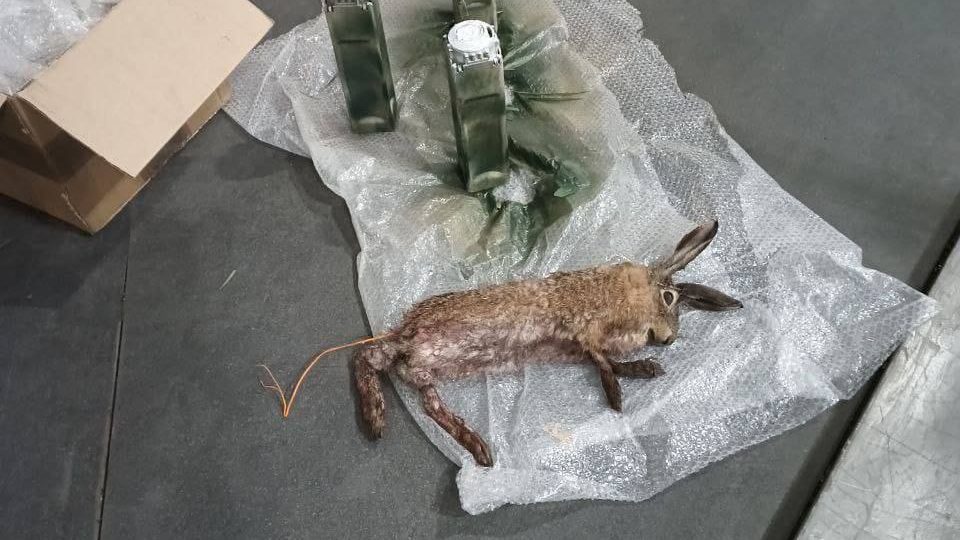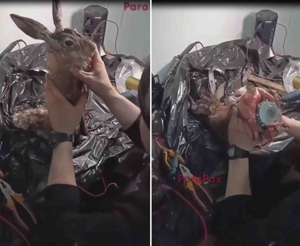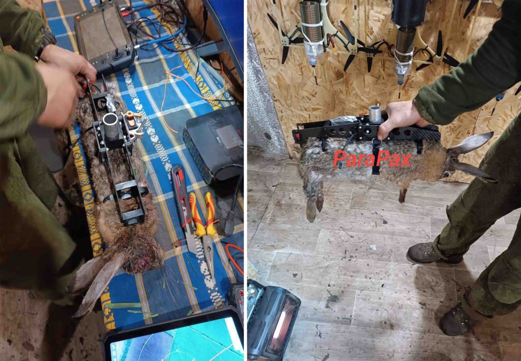 За інформацією джерела, такі “заряджені” туші в подальшому скидаються з дронів як для мінування місцевості, так і з можливістю точкового удару по позиціях українських захисників. Зокрема, було показано зображення туші зайця з встановленою вибухівкою та дрона з уже закріпленою підготовленою тушею.